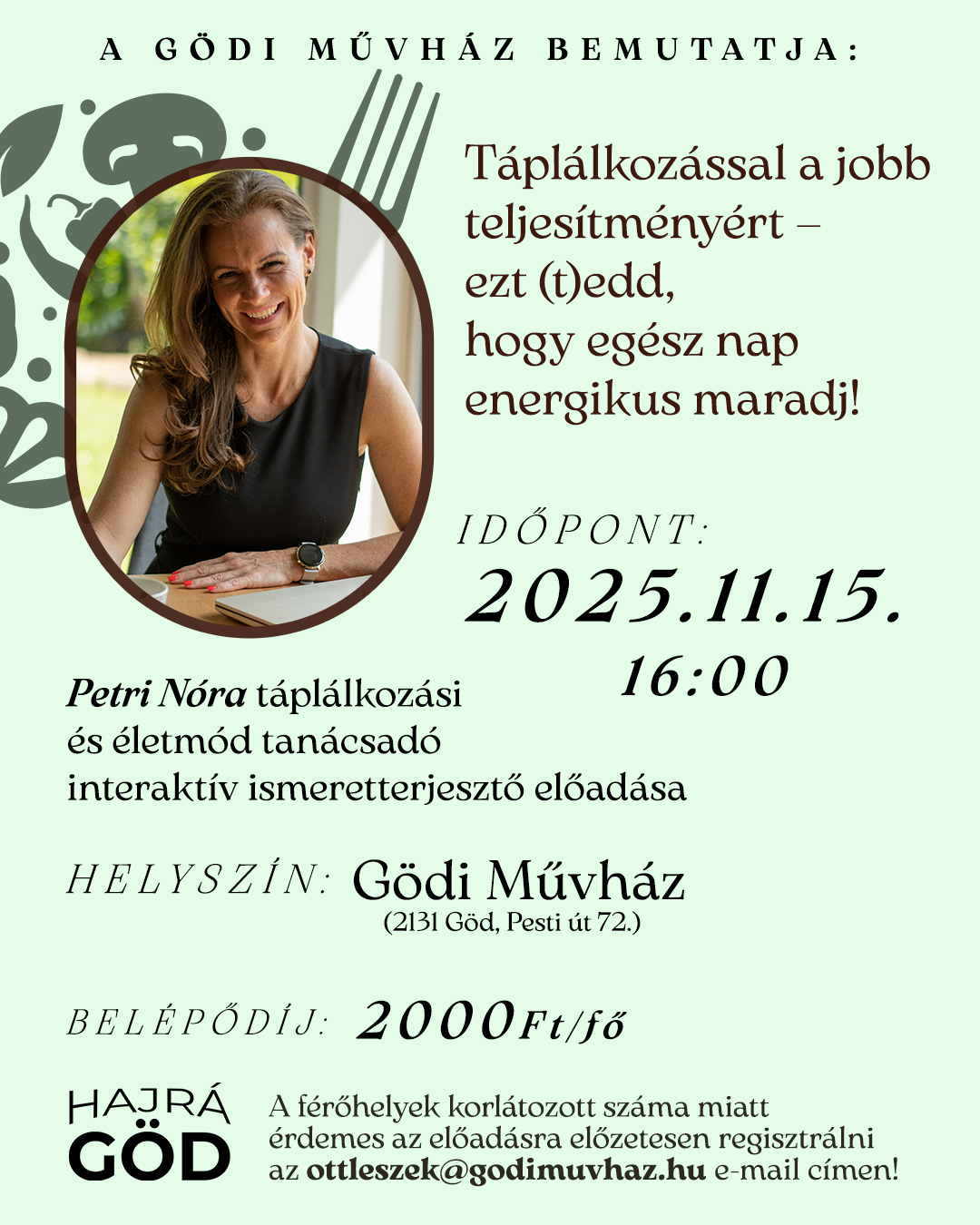 A táplálkozási tanácsadó interaktív ismeretterjesztő előadása november 15-én, szombaton lesz a Gödi Művelődési Házban.
