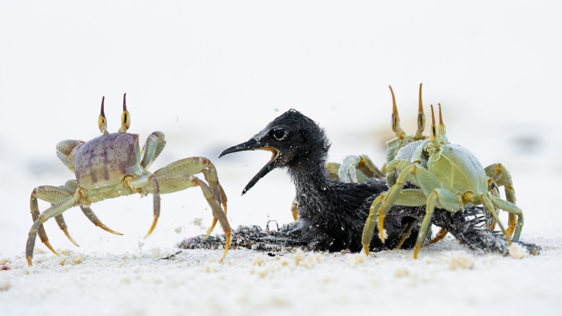 A fotós másik kiállított képe azt a különleges pillanatot ábrázolja, amikor egy barna noddi fiókára rákok támadnak a tengerparton.