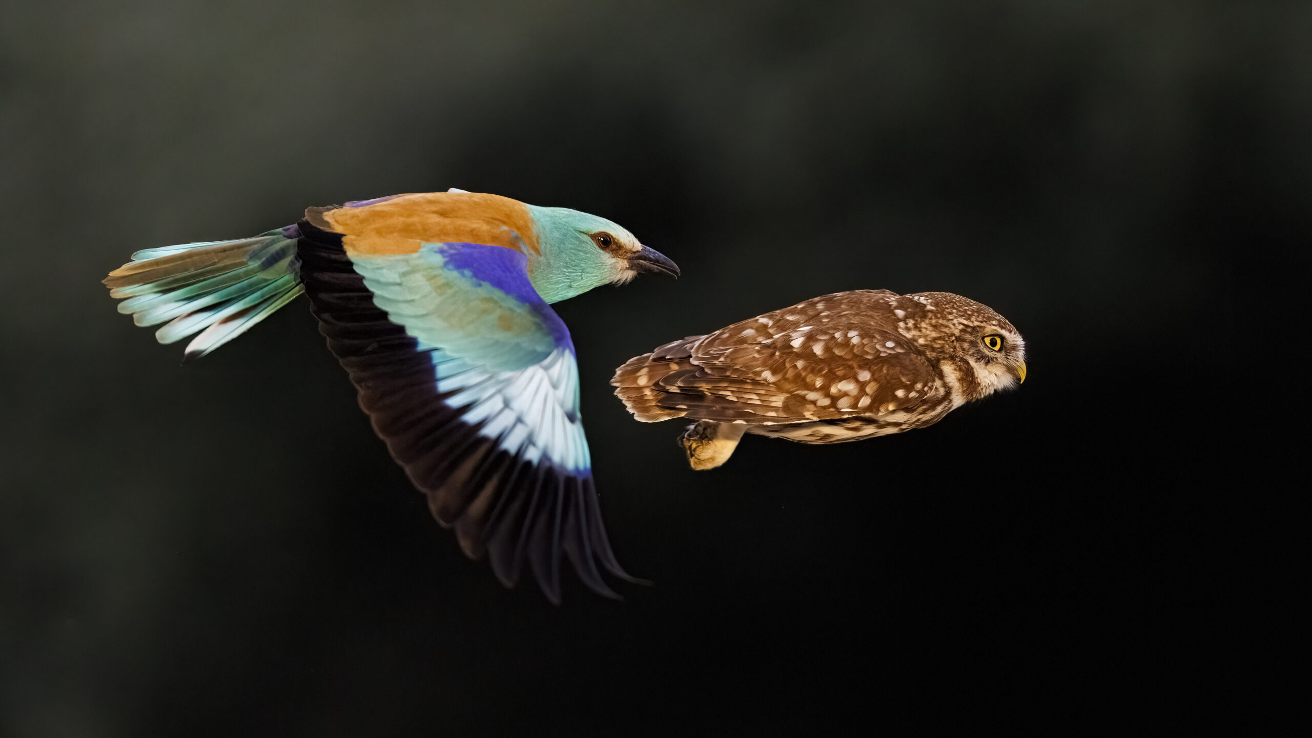 “Míg a szalakóta folyamatosan nyitott szárnyakkal repül, addig a kuvik pillanatokra teljesen becsukja azokat, ekkor zömök teste golyógént repül előre. Ezt a rövid pillanatot sikerült elcsípnem az alatt a 26 nap alatt, amelyet megszakítás nélkül egy lesben töltöttem a megfigyelésükkel. Összesen több mint tíz alkalommal láttam hasonló jelenetet, de rendkívüli sebessége és kiszámíthatatlan iránya miatt mindössze egyszer tudtam megfelelően lefényképezni” – mondta el Máté Bence Londonban.