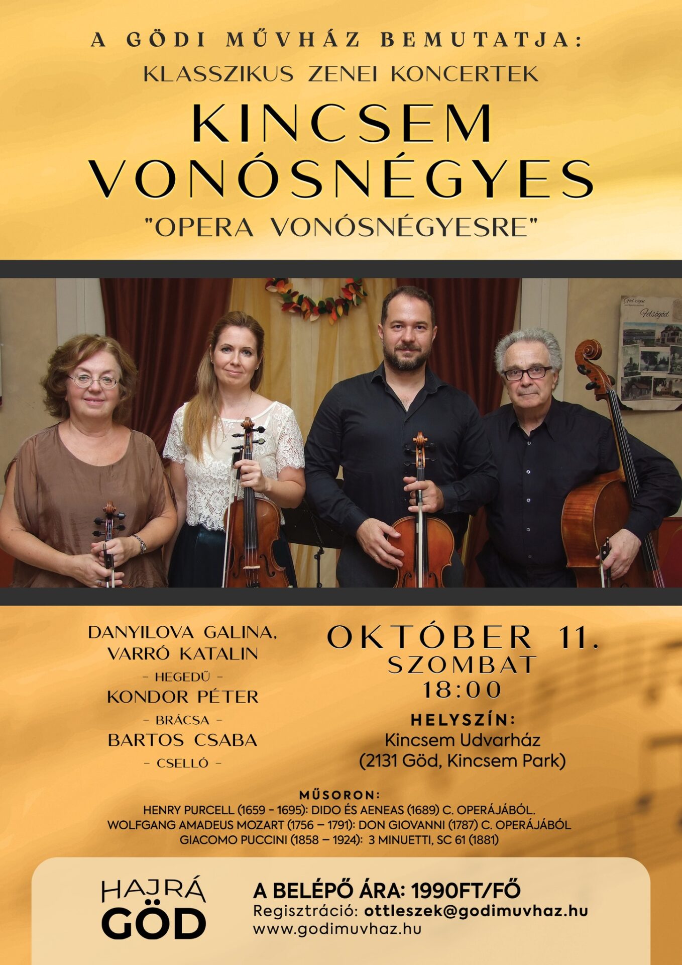 Október 11-én, szombaton 18 órától a Kincsem Vonósnégyes ad koncertet a Kincsem Udvarházban. A belépő 1990 forint, a három előadásra szóló bérlet ára 5000 forint.