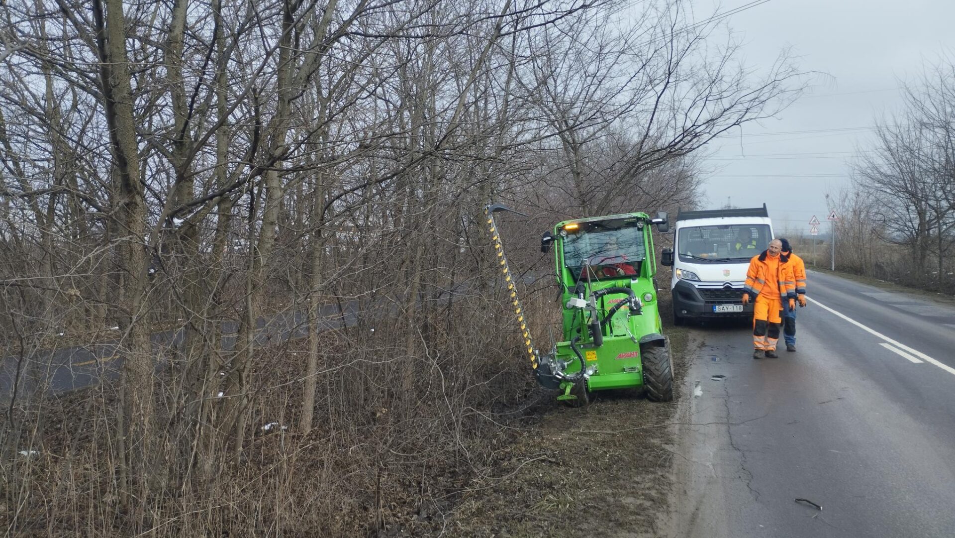 A speciális vágóadapterrel felszerelt zöld munkagép segítségével a szakemberek jelentős mennyiségű zöldhulladékot távolítottak el az útmenti területekről.